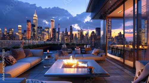 A modern terrace lounge with a sleek fire table, elegant sofas, and a stunning view of a vibrant city skyline at twilight, with the buildings glowing in the evening light.