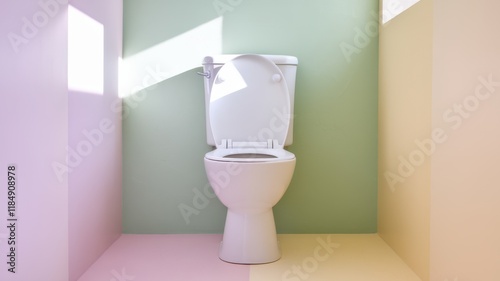 A modern white toilet in a minimalist bathroom with pastel green and yellow walls, creating a bright and airy atmosphere.