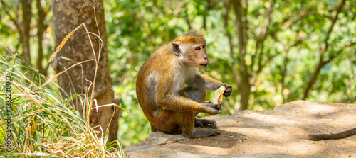 A monkey sits in the jungle and eats a banana. A wildlife scene with wild animals.