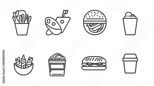 A monochrome outline drawing of various fast food items including fries burger and popcorn in containers