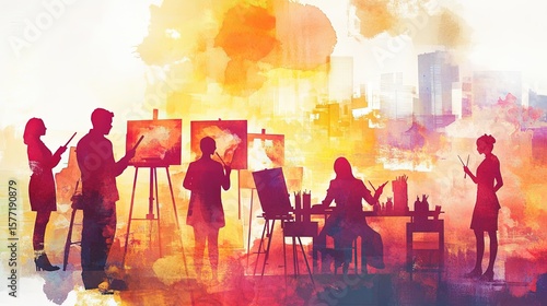 A montage featuring silhouettes of people painting with watercolors, experimenting with techniques, and creating artwork. The background includes an art studio and a cityscape with galleries