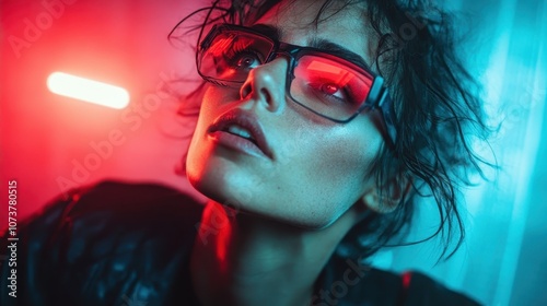 A moody individual wearing glasses under striking red and blue lighting, showcasing an edgy and modern style with a hint of introspection and mystery.