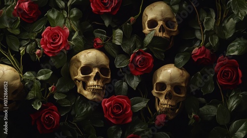 A moody still life of skulls and red roses, evoking a sense of mortality and beauty.