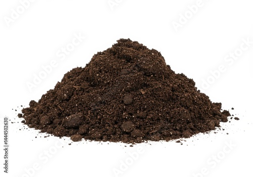 A mound of dark brown soil or dirt is piled up against a plain white background in a studio shot