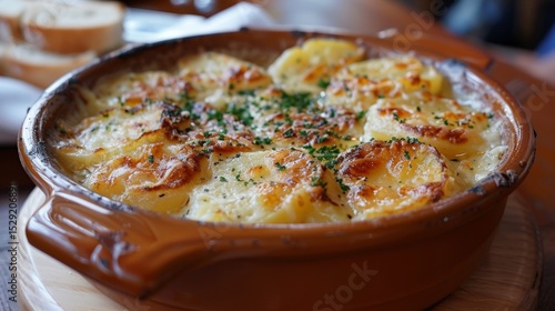 A mouthwatering dish of golden-brown cheesy potato gratin, featuring baked layers of tender potatoes and creamy sauce, perfect for a comforting meal any time.