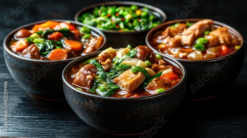 A mouthwatering display of four bowls filled with hearty stews exhibiting vibrant colors and textures, evoking comfort and the joy of sharing good food.