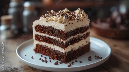 A mouthwatering slice of chocolate cake with cream frosting on a white plate, ready to enjoy.
