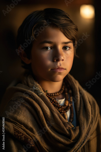 A moving portrait of a Pueblo boy wearing traditional clothing