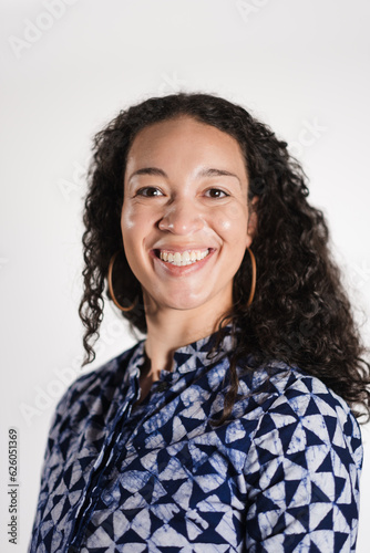 A multiracial woman smiles for an in-studio portrait. She has a button-down shirt, and her wavy hair goes past her shoulders.