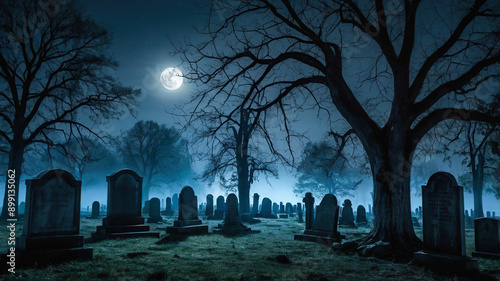 A mysterious cemetery shrouded in fog in the moonlight. Ancient tombstones and bare trees create an ominous atmosphere. The moon adds a mysterious light, enhancing the sense of eeriness.