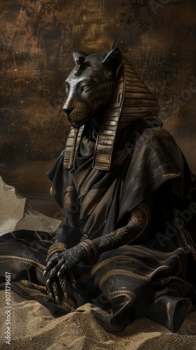 A mysterious sphinx clad in riddle-inspired attire sits regally against a desert backdrop, embodying wisdom and ancient mystique suitable for mythological themes.