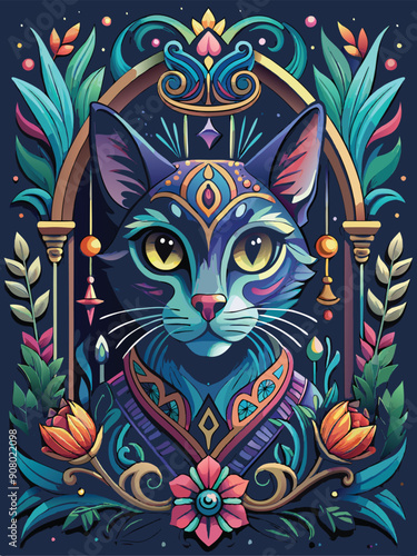A Mystical Cat Portrait Adorned with Floral and Geometric Patterns