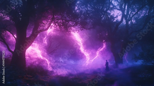 A mystical forest scene with glowing purple lightning and a figure standing among tall trees in a dreamy atmosphere.