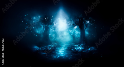 A mystical path glows with ethereal blue light, drawing you deeper into a shadowy, enchanted forest scene at night. Trees silhouette against the bright magical illumination.