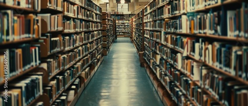 A narrow aisle in a library, lined with tall bookshelves filled with numerous books, stretches into the distance under warm lighting.