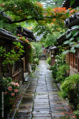 A narrow alley in a traditional Japanese town