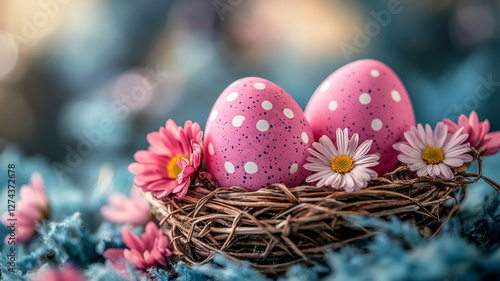 A nest of pink Easter eggs and pink flowers. An Easter card.