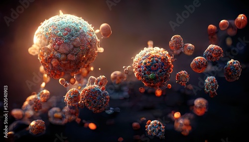 A new generation of dangerous corona flu floating pathogen respiratory influenza virus cell microscopic view. Illustration.