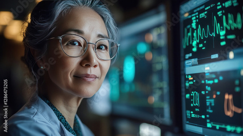 A nurse remotely monitoring an elderly patient's vital signs using a digital health dashboard