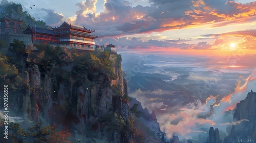 a painting of a building on a mountain side with a sunset in the background and clouds in the sky