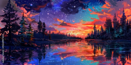 A painting of a night sky with stars above a lake.