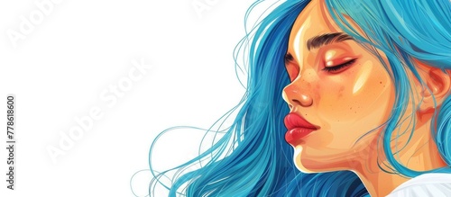 a painting of a woman with blue hair and red lips . High quality