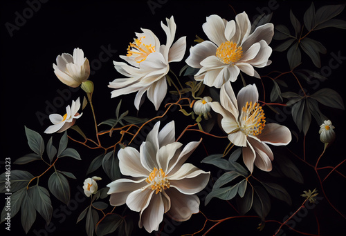 a painting of white flowers on a black background, generative AI