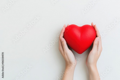 A pair of hands gently cradle a red heart, symbolizing love, compassion, and emotional connection on a neutral background.