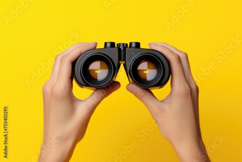A pair of hands holding a pair of binoculars. Suitable for exploration and adventure concepts