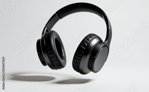 A pair of sleek, black wireless headphones levitating against a clean white background, showcasing modern audio technology.