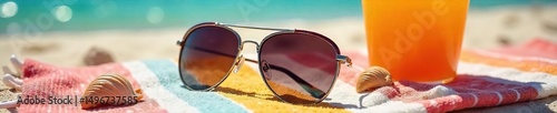 A pair of stylish sunglasses rests on a sun-drenched beach towel, next to seashells and a summer drink, ready for a perfect sunny day The vibrant colors evoke a carefree summer vibe , drink, vacation