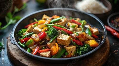 A pan of sizzling stir-fried vegetables and tofu, with steam rising and bright, vibrant colors, served with a side of jasmine rice.