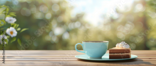 A pastel blue coffee cup and a slice of cake sit on a wooden table outdoors, surrounded by soft morning light and a blurred floral background.