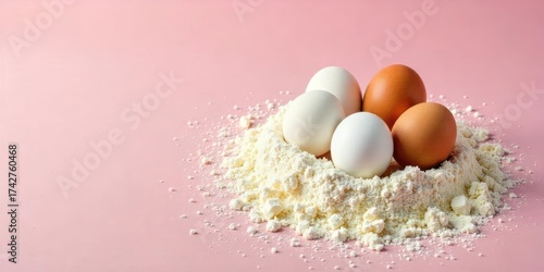 A pastel pink background showcases a small mound of flour, nestled within which are two brown eggs and two white eggs, creating a visually appealing composition.