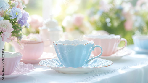 A pastel-colored garden tea party with light pink and blue table settings, pastel flowers, and delicate teacups, evoking an elegant vibe --chaos