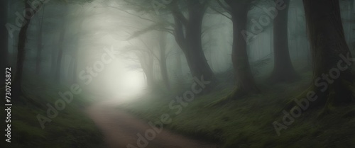 a path in a mysterious misty forest. Art wallpaper on the wall