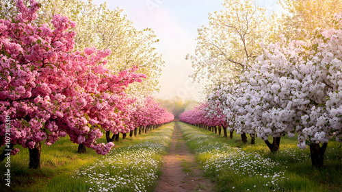 A pathway through a blossoming orchard with pink and white flowers.