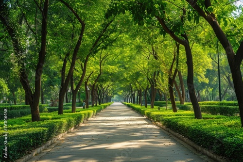 A paved pathway runs through a park, bordered by tall trees and neatly trimmed hedges, A serene tree-lined walkway in a tranquil city park, AI Generated