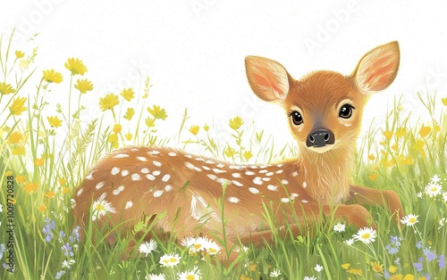 A peaceful fawn resting among vibrant wildflowers in a sunlit meadow on a warm spring day
