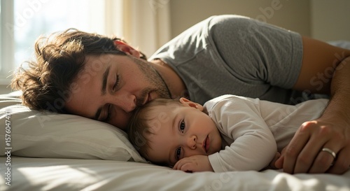 A peaceful moment: father and baby sharing a nap together, filled with love and tenderness in a bright bedroom.