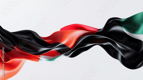 A perfectly angled 3D render of the UAE flag flying high, its vibrant colors contrasting beautifully with the white background