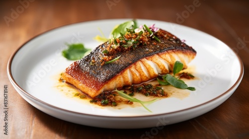 A perfectly cooked salmon fillet with crispy skin, served on a white plate with a flavorful sauce and fresh herbs.