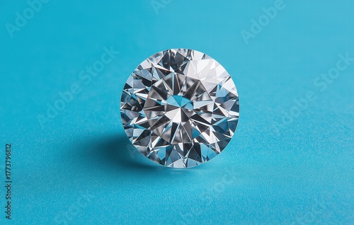 A perfectly cut round diamond with brilliant facets on a vibrant turquoise blue background