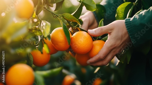 A person harvesting fresh, ripe oranges from a tree in a sunny orchard, showcasing the vibrant colors and healthy produce of citrus fruits.