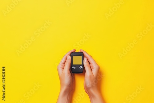 A person holding a blood glucose meter against a bright yellow background in a studio setting overhead view