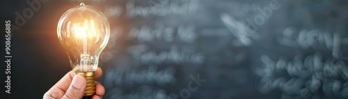 A person holding a glowing light bulb in front of a chalkboard with mathematical equations. Concept of innovation and education.
