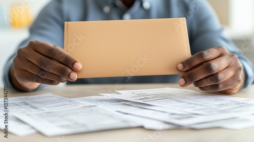 A person holds an envelope while surrounded by various papers, suggesting themes of correspondence, organization, or financial matters.