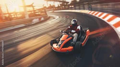 A person in a go-kart speeds through a racetrack curving sharply, embraced by sunlight, signifying adrenaline and speed.