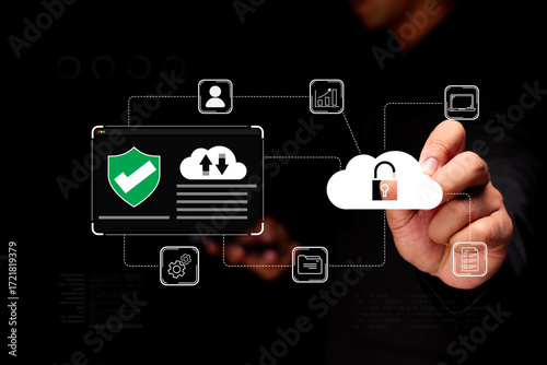 A person interacts with digital cloud technology, highlighting data security and information management through icons and visual elements.