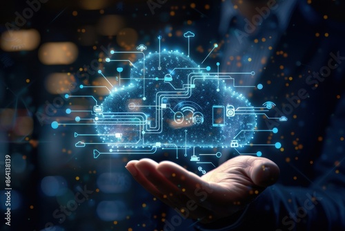 A person is holding a cloud with many icon. Cloud Database technology concept